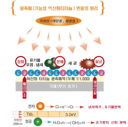 마치 태양전지의 원리처럼 - 전기를 가진 전자(e-)와 +전기를 가진 정공(h+)이 형성됩니다. 그중에서 정공(h+)는 특히 강력한 산화작용을 하는 수산화물(OH Radical)을 형성하여 살균용 염소나 차아염소산 오존보다도 강력한 산화력을 갖게 됩니다. 또한 전자는 광촉매에 흡착되어 있는 산소를 산소이온으로생성시키는데 이 산소이온은 산화반응의 중간체와 과산화물을 생성하든가 과산화 수소를 통하여 물의 반응 등을 생성합니다.